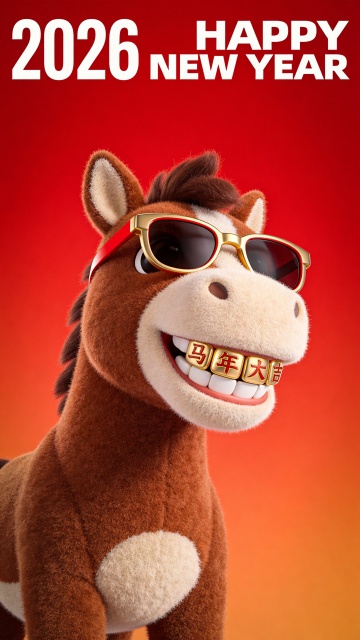 3D卡通马戴金框墨镜,鎏金牙套“马年大吉”,毛发生长细节逼真,喜庆红橙渐变背景,拟人风贺岁海报。