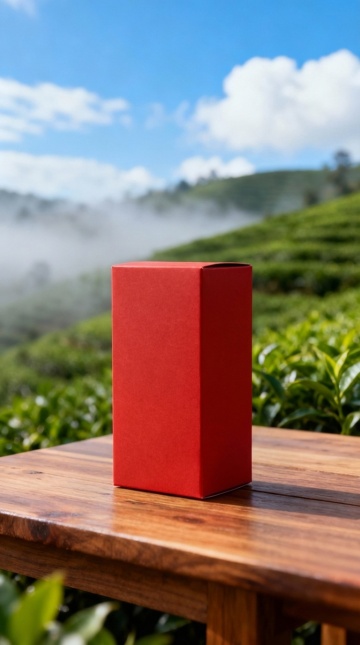 红盒静置木桌,茶山雾霭环绕,双色设计融合自然风与轻拟物感,简约中透出质朴与清新,实景感十足,尽显柔和舒适之境。