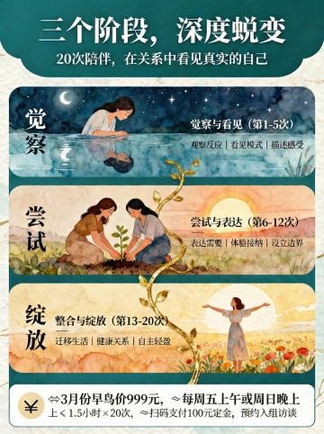 温暖水彩插画风,卡通人物围坐共学,手账式排版融入哲思文字,传递双向成长的温馨感与人文温度。