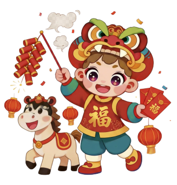 喜庆红底,剪纸风白马踏云,手持“恭喜发财”卷轴,背负金元宝,融合撕纸与国潮元素,卡通造型传递中式新春祝福。