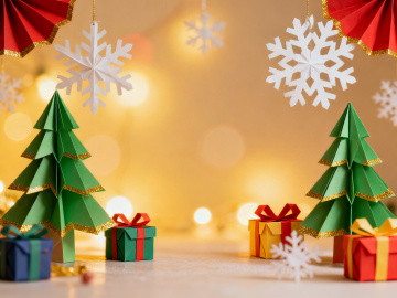 剪纸风与拼贴风结合的圣诞树,红绿金白层层叠叠,几何造型简约生动,金色星星点亮节日喜庆,温馨趣味跃然纸上。