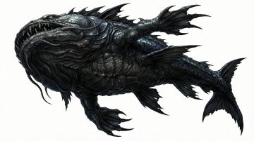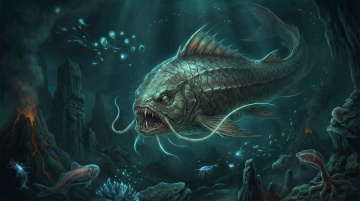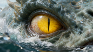 16:9比例的画面,以深邃暗调深海为背景,依次呈现巨型怪兽睁眼扫视、张开巨口喷出口水的过程,搭配怪兽嘶吼与气流冲击声,暗调光影营造出极致恐怖震撼的压迫感。