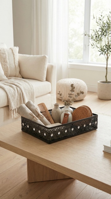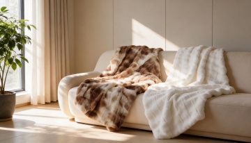 一张温馨风格的卧室床铺三维渲染图,浅米色软包床头板搭配同色系床架,床上铺着浅棕色与白色交织的格纹被子,被子自然蓬松有褶皱,上方摆放两个白色长方形枕头和一个同色系格纹小抱枕,整体色调温暖柔和,光线明亮柔和从侧面照射形成轻微阴影,展现出舒适柔软的织物质感,营造出宁静舒适的居家氛围。