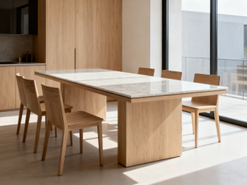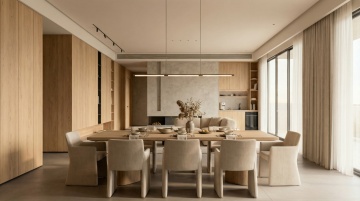 现代感与简约主义交融,木质纹理与大面积玻璃营造清透宽阔空间,3D风光影交错,重拟物设计凸显舒适质感,面料与木雕元素自然呼应。