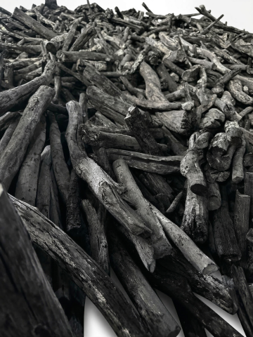 一张深棕色木质桌面上放置着一块带有自然木纹和边缘不规则的深色木板,右侧有一个浅棕色编织藤篮,背景为带有竖条纹纹理的深色木质墙面,整体呈现温暖深沉的色调,光线从左上方柔和照射,形成明显的光影对比和细腻的木纹质感,营造出质朴自然的复古氛围。