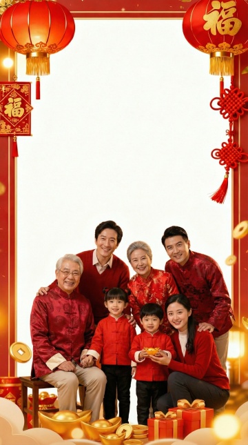 国潮风卷轴设计,融合刺绣与鎏金元素,展现中式喜庆实景。团圆宴、舞龙与春联场景交织,传递浓厚年味与节日氛围。