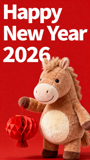 毛绒质感“新年快乐”大字搭配国潮风卡通玩偶,融合浮雕式文字与喜庆红金配色,营造出可爱又热闹的节日氛围,传递2026年新春祝福。
