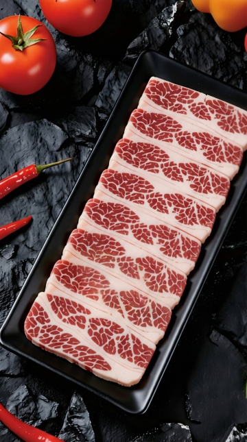 高清摄影,白色纯净背景,黑色圆形盘子盛放着新鲜生牛肉片,牛肉片呈现自然的粉红色泽与白色脂肪纹理相间的大理石花纹,肉质纹理清晰可见,肉片以新的堆叠造型平铺盘中,顶部点缀一小撮翠绿的香菜叶,光线明亮柔和,从上方均匀照射,牛肉表面有细微光泽,阴影浅淡自然,整体画面干净整洁,突出食材的新鲜质感与原生态,构图饱满居中,视觉焦点明确。