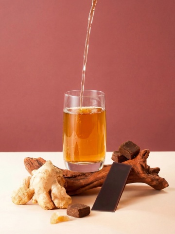 高清摄影风格,新鲜生姜特写,有精华油从上边滴落在堆叠的完整生姜块与切片,生姜表皮呈自然浅棕色带纹理,切面为明亮的淡黄色,质地细腻,3-4片姜片散落在生姜块前方,后侧有2片翠绿的生姜叶,叶脉清晰,整体光线明亮柔和,高对比度,突出生姜的新鲜质感和立体感,纯深色背景,无阴影,主体清晰突出,色彩真实还原,细节丰富。