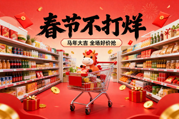生成一张线上超市banner海报,主题是:春节不打烊,小字:马年大吉 全场好价抢,苍劲有力! 要求:红色主题,有马年元素,有购物车,满场的购物架上全是商品,红包,金币,礼品盒等。喜庆,活泼。