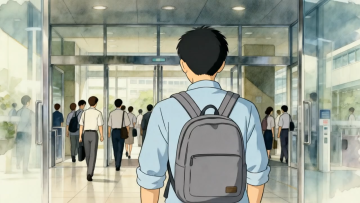 动漫风水彩质感,现代都市商务场景,光影柔和自然,人物背影穿行于玻璃幕墙大厅,营造清新通透的上班日常氛围。