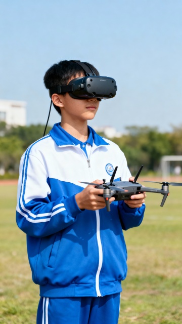 简约现代风格的无人机产品展示图,单架无人机居中规整排布,纯色背景,无任何文字、logo和水印。无人机采用金属灰为主色调,机身线条流畅,细节精致,配备四个螺旋桨和前置摄像头,底部有绿色指示灯。整体画面干净利落,光影柔和,突出无人机的科技感和现代设计美学。