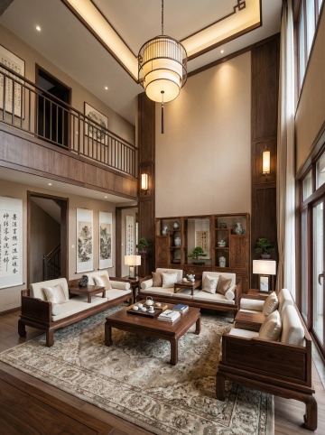 俯视角构图,一座充满侘寂美学的日式客厅,浅灰色亚麻布艺转角沙发搭配三个深棕色棉麻靠垫,沙发前铺设着带有自然纹理的浅橡木色低矮茶几,茶几上静置着一个粗陶花瓶,插着两枝干枯的芦苇。左侧墙面悬挂着三幅无框水墨挂画,右侧立着一个原木色梯形置物架,摆放着几个手工陶瓷器皿。自然光从右侧木质格栅推拉门温柔渗入,在深灰色微水泥地面上投下斑驳的光影,墙角处一盆琴叶榕舒展着宽大叶片,置于粗陶花器中。天花板悬挂着一盏纸灯笼造型吊灯,整体色调以原木色、浅灰和米白为主,营造出宁静质朴、岁月静好的氛围,细节处彰显自然材质的肌理之美。