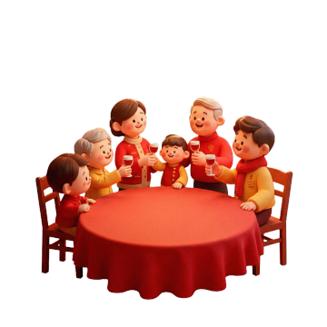 国潮风与重拟物结合,中式庭院实景中,全家围坐圆桌共庆新春,红金刺绣服饰映衬喜庆氛围,油画质感呈现温暖团圆时刻。