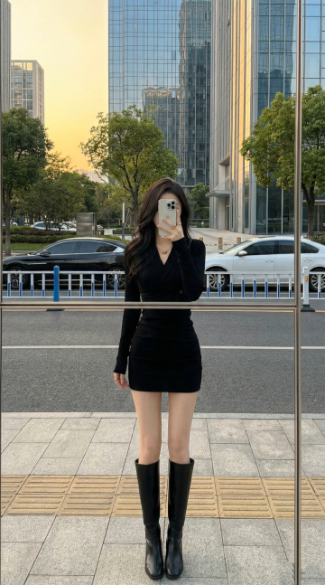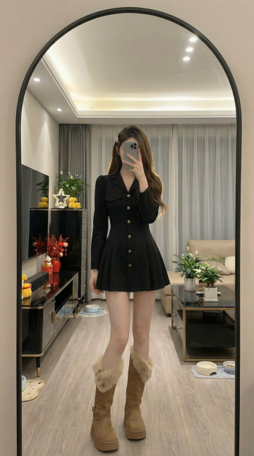 现代简约风格,轻拟物风设计,黑色连衣裙搭配毛绒靴,展现时尚优雅与温馨氛围,实景拍摄凸显面料质感与节日气息。