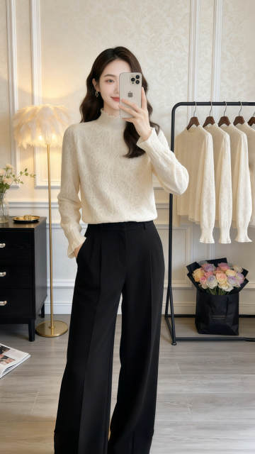 现代简约风格,黑色丝绒连衣裙搭配米色蝴蝶结与毛绒雪地靴,展现优雅时尚与温馨质感,实景拍摄突出面料细节与冬日氛围。