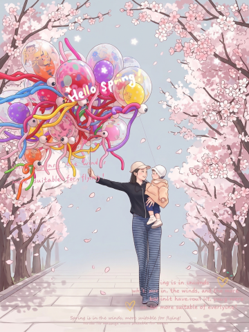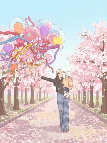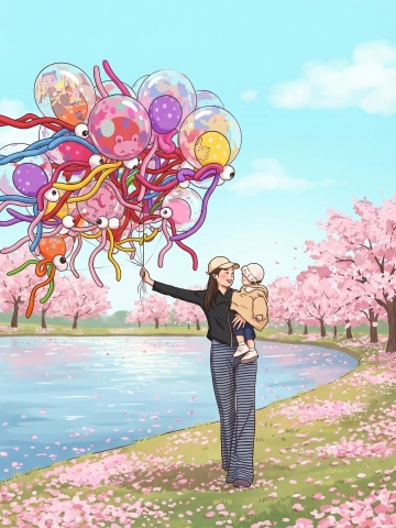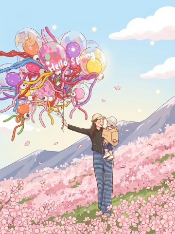 清新水彩风插画,卡通手账感,描绘春日野餐欢乐场景。