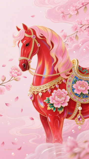 鎏金浮雕风白骏马,配以华丽珠饰与祥云花卉,红金背景尽显中式奢华与喜庆,国潮插画风中透出古典优雅之美。