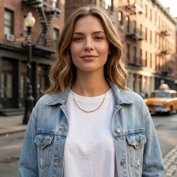 一位女性迎着晨光,轻松自信地走在城市街道上