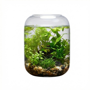 拟人风小鼠凝视玻璃鱼缸,水彩质感的鱼儿游动,重拟物风实景呈现清新可爱感,营造舒适温馨氛围。