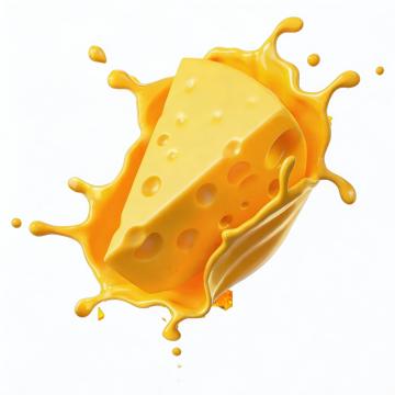 3D重拟物风格,液态奶酪飞溅环绕奶酪块,强体积感与酷炫动态,趣味十足,适合节日美食主题设计。