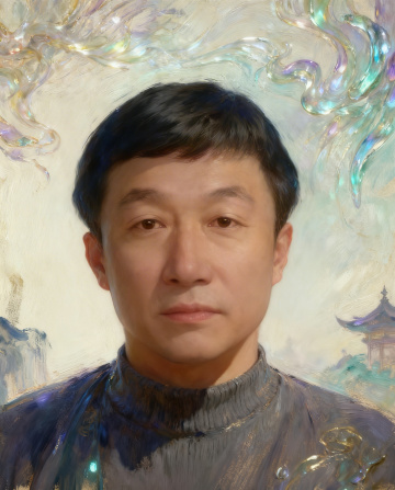 水墨风与科技感交织,古典人物凝视水滴中的龙影,虚拟现实投影浮现神秘符阵,国潮风中透出静谧梦幻之境。