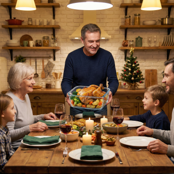国潮风与重拟物结合,中式庭院实景中,全家围坐圆桌共庆新春,红金刺绣服饰映衬喜庆氛围,油画质感呈现温暖团圆时刻。