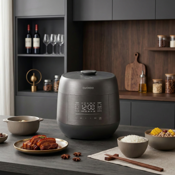 现代感与科技感交融的厨房场景,金属风电饭煲置于大理石台面,搭配清新果蔬与轻拟物设计,营造简约主义下的清爽舒适氛围。