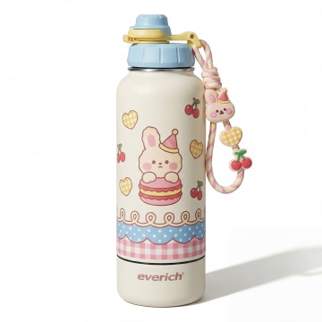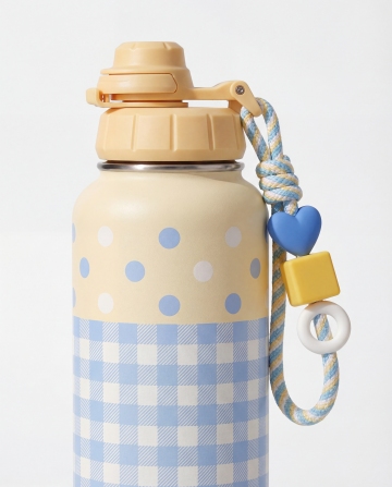 奶油色水壶搭配蓝白波点与格纹,扁平风与轻拟物结合,点缀心形挂饰,清新甜美,柔软舒适,节日氛围感十足。