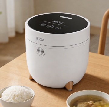 米白色电饭煲,周围环绕厨房台面及新鲜食材(白米、稻穗、绿叶蔬菜),现代简约风格,温馨自然氛围,明亮柔和光线,高清质感,白色背景的要求,