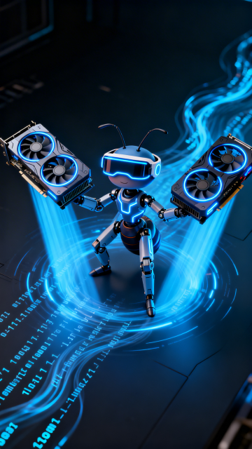 软3D风格的未来感机器人,融合金属风与毛发生长设计,霓虹灯蓝光点缀,拟人化卡通造型,科技与可爱并存,节日氛围浓厚。