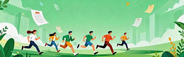卡通感十足的扁平风插画,清新可爱,人物奔跑姿态充满趣味,搭配柔和色彩与简约植物背景,传递轻松愉悦的日常氛围。详情