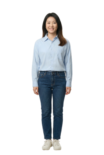 一张年轻亚洲女性的全身人像摄影,纯灰色纯色背景,柔和均匀的顶光照明,人物主体清晰锐利,皮肤质感细腻自然,黑发自然垂落,面部表情平静略带微笑,人物姿态为站姿,双手背于身后,双腿并拢微微分开。穿搭风格为时尚休闲风,上身穿着一件黑色圆领短袖修身T恤,下身搭配一条高腰浅蓝色牛仔短裤,脚穿白色中筒袜和黑色帆布鞋,整体造型青春活力,构图采用经典全身人像构图,人物位于画面中央,占据大部分视觉空间,画面简洁干净,突出人物主体和服装展示效果,专业商业人像摄影风格,高清细节,色彩还原真实自然。