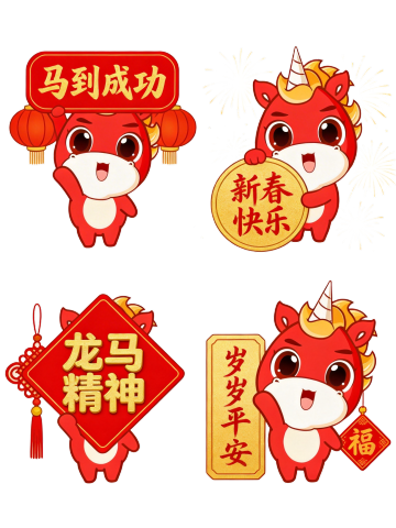 插画风国潮萌马团,拟人化卡通形象喜庆登场,剪纸元素点缀,红金配色传递新年福气与吉祥寓意。