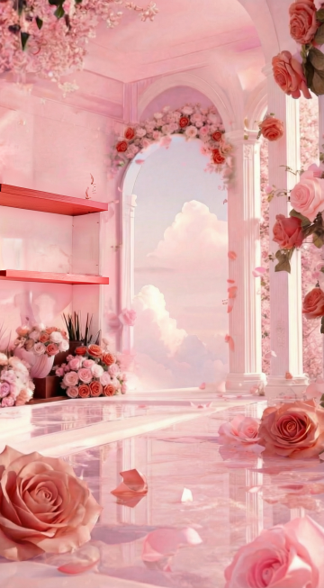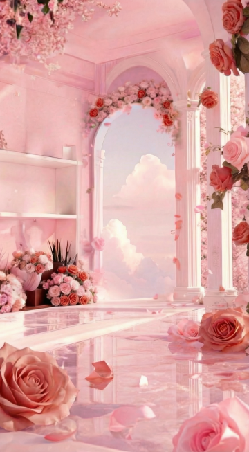 梦幻3D风,虚拟自然场景,甜美浪漫的樱花窗前,花瓣飘落,营造温馨氛围。