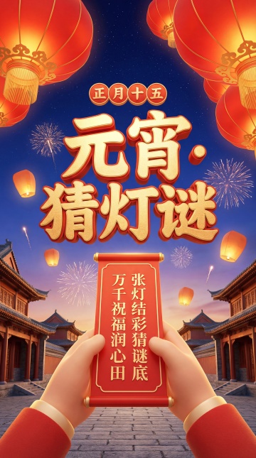 国潮风3D海报,鎏金大字搭配浮雕质感,古典建筑与红灯笼烘托喜庆氛围,元宵节猜灯谜主题尽显中式美学。