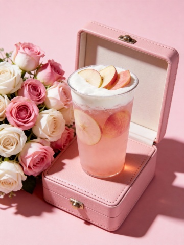 中式美学意境,轻拟物风搭配木雕质感底座,草莓饮品层叠如云霞,柔光渲染出唯美感与清新感,布艺与枝叶点缀,质朴中见细腻。