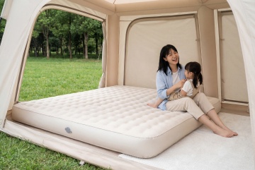 一张温馨的卧室场景,中央是一张铺着棕色床垫的床,床垫表面柔软舒适,带有自然的纹理。阳光透过窗户洒在床垫上,形成温暖的光斑。床头柜上摆放着一盏柔和的台灯和一盆绿色植物,整体色调温暖柔和,营造出舒适、放松的居家氛围。