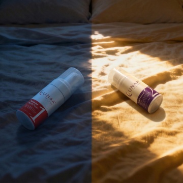一张温馨的卧室场景,中央是一张铺着棕色床垫的床,床垫表面柔软舒适,带有自然的纹理。阳光透过窗户洒在床垫上,形成温暖的光斑。床头柜上摆放着一盏柔和的台灯和一盆绿色植物,整体色调温暖柔和,营造出舒适、放松的居家氛围。