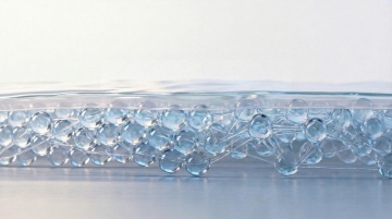画面中透明水泡在白色背景下轻盈漂浮,呈现浅浅的蓝绿色调,表面折射出明亮光泽,整体清新通透