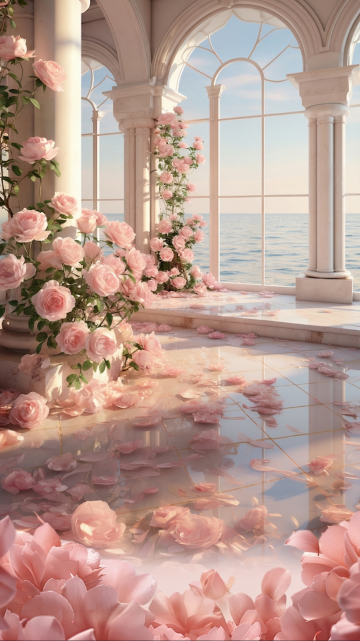 梦幻3D风,虚拟自然场景,甜美浪漫的樱花窗前,花瓣飘落,营造温馨氛围。