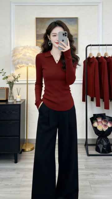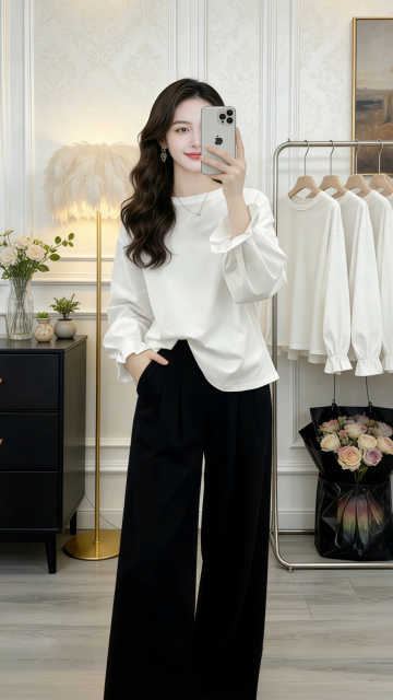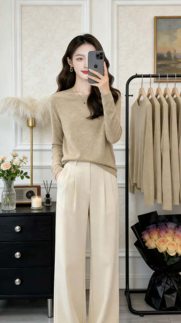 优雅柔光下的商务时尚穿搭,柔和色调与面料质感交织,实景空间营造舒适高级感,展现都市女性的从容魅力。