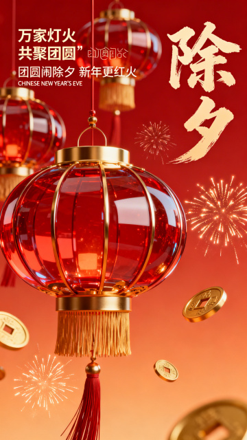 3D重拟物风格中式灯笼,玻璃质感搭配鎏金细节,喜庆红金配色,烟花与铜钱环绕,营造浓厚除夕节日氛围。