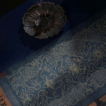 一张具有东方传统美学风格的无缝背景纹样图,纹样为精致的缠枝莲纹,线条流畅细腻,以深蓝色为底色,金色线条勾勒纹样轮廓,整体呈现出典雅庄重的氛围,纹样排列整齐有序,形成高度对称且具有节奏感的重复图案,适合用于传统服饰、包装设计或文化产品的背景装饰。