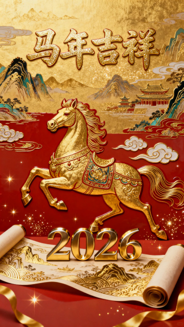 鎏金浮雕骏马跃动,中式古典山水卷轴铺陈,3D重拟物风呈现喜庆奢华,金属质感闪耀2026马年吉祥。