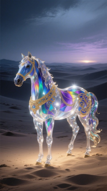 梦幻感与未来感交织的玻璃风水晶马,3D渲染呈现液态光影流动,超现实主义沙漠夜景中透出清透唯美感,科技与优雅共舞。