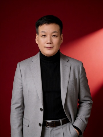 商务感十足的单色设计风肖像,金属质感腰带点缀,红灰光影交织,营造高级实景氛围。