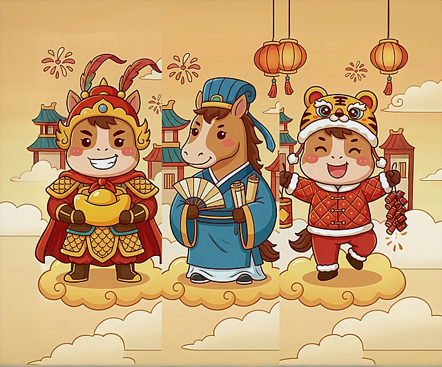 纯扁平风格,描边工笔插画, 主体是饰有福纹彩纹鞍具的金眼鎏金棕马(金色鬃毛带金属光泽,金眼柔和有神,呈静立衔宫灯姿态,周身萦绕淡金光晕,充满神圣感与温婉感)。背景为热闹的新春古街灯会,青石板路两侧挂满红灯笼与生肖灯,人流穿梭,浪涛元素化作金色光带环绕蹄边。点缀糖葫芦与剪纸元素,色调以棕、金、红为主,市井喜庆氛围拉满。详情