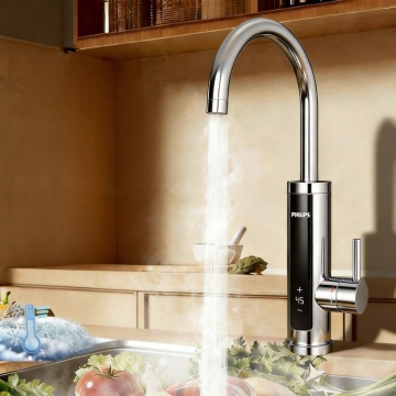 超写实3D渲染的现代厨房水龙头特写,极简主义设计风格,银色金属质感水龙头搭配可旋转出水口,安装在白色光滑人造石台面上,嵌入式不锈钢水槽带有圆形排水口,下方为深灰色哑光橱柜配银色长条形拉手,背景是浅色木质地板,柔和自然光从上方照射形成细腻高光与阴影,整体呈现干净、高级、宁静的氛围,注重材质纹理细节与空间层次感,不同角度展示水龙头在现代厨房环境中的多种布局搭配。