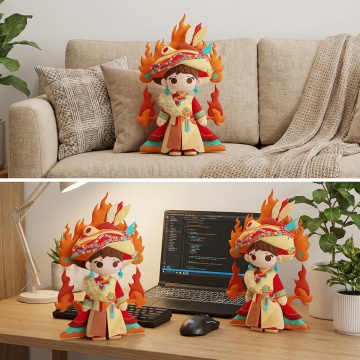 软3D风格的卡通女孩,融合民族元素与可爱设计,色彩斑斓的服饰展现节日氛围,面料质感细腻,充满童趣与文化韵味。